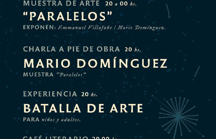 Además, se podrá visitar la muestra de arte Paralelos que reúne a los artistas plásticos Mario Domínguez y Emmanuel Villafañe. La misma propone un recorrido por paisajes que combinan colores y formas que van desde los tonos agrestes del norte hasta horizontes abiertos e ilimitados.